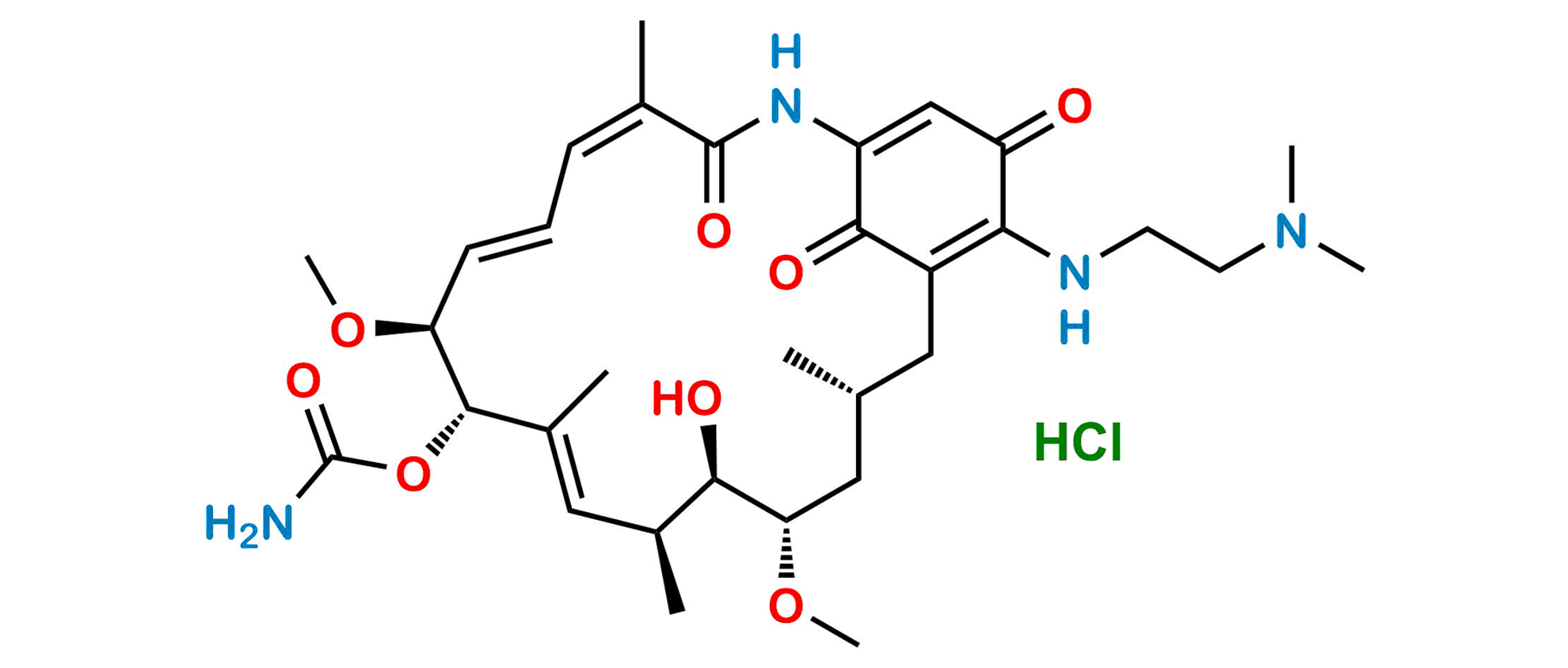 Smile: C/C(C(NC(C1=O)=C2)=O)=C/C=C/[C@H](OC)[C@@H](OC(N)=O)/C(C)=C/[C@H](C)[C@@H](O)[C@@H](OC)C[C@H](C)CC1=C(NCCN(C)C)C2=O.Cl