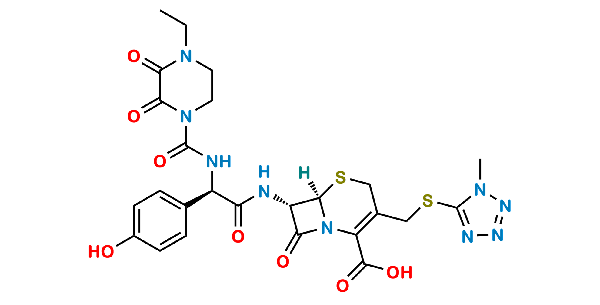 Chemical Name: (6R,7S)-7-[[(2R)-2-[[(4-ethyl-2,3-dioxopiperazine-1-yl)carbonyl]amino]-2-(4-hydroxyphenyl)acetyl]amino]-3-[[(1methyl-1H-tetrazol-5-yl)sulfanyl]methyl]-8-oxo-5-thia-1-azabicyclo[4.2.0]oct-2-ene-2-carboxylic acid (as per EP)