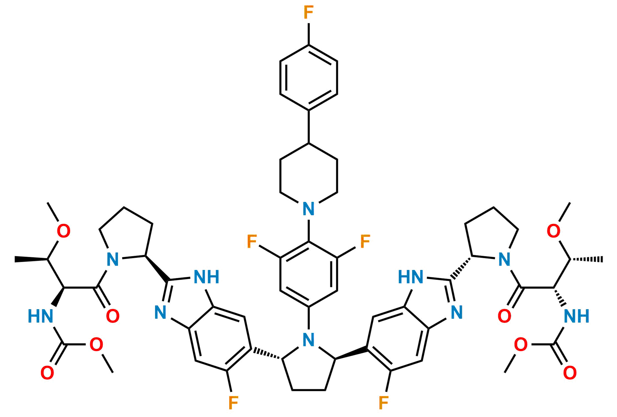 Chemical Name: Dimethyl ((2S,2'S,3R,3'R)-((2S,2'S)-(((2R,5R)-1-(3,5-difluoro-4-(4-(4-fluorophenyl)piperidin-1-yl)phenyl)pyrrolidine-2,5-diyl)bis(5-fluoro-1H-benzo[d]imidazole-6,2-diyl))bis(pyrrolidine-2,1-diyl))bis(3-methoxy-1-oxobutane-1,2-diyl))dicarbamate
