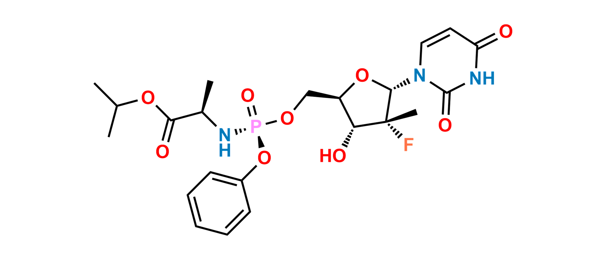 Chemical Name: isopropyl ((S)-(((2R,3R,4R,5S)-5-(2,4-dioxo-3,4-dihydropyrimidin-1(2H)-yl)-4-fluoro-3-hydroxy-4-methyltetrahydrofuran-2-yl)methoxy)(phenoxy)phosphoryl)-D-alaninate