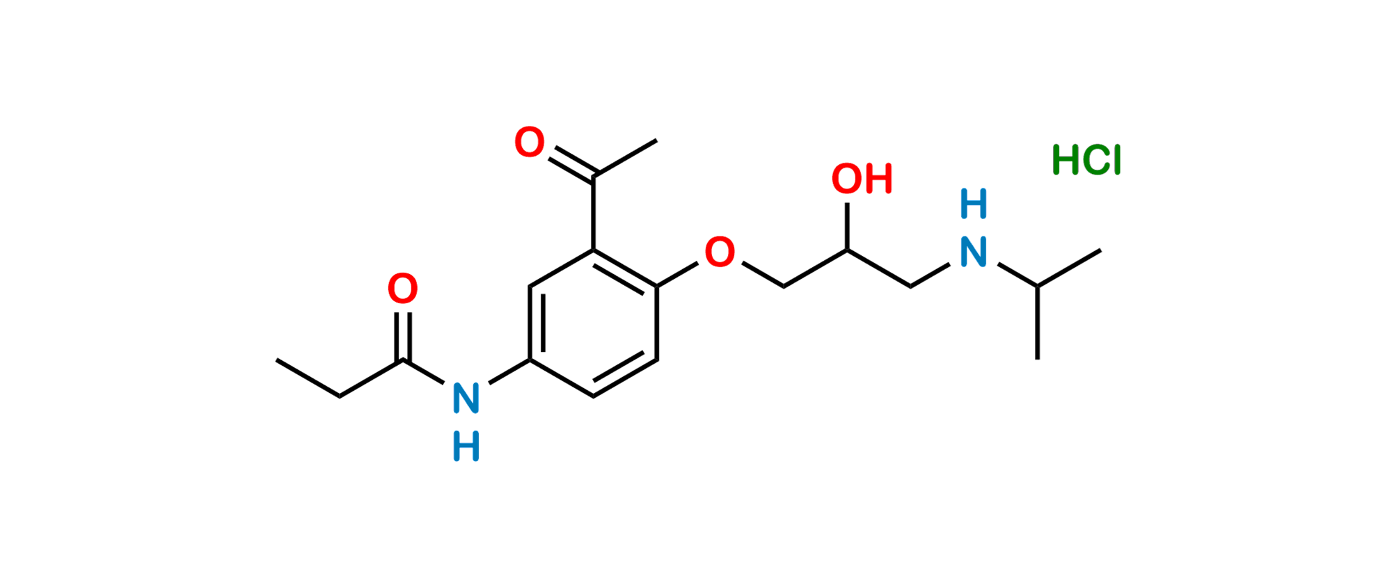 Chemical Name: N-[3-Acetyl-4-[(2RS)-2-hydroxy-3-[(1-methylethyl) amino] propoxy] phenyl] propanamide hydrochloride (as per EP)