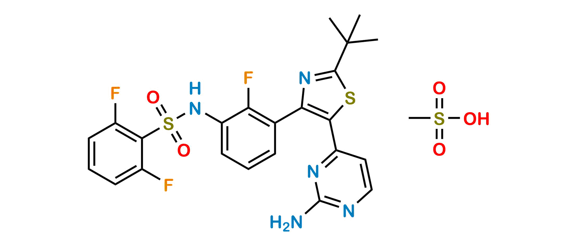 Smile: FC1=C(C2=C(SC(C(C)(C)C)=N2)C3=NC(N)=NC=C3)C=CC=C1NS(=O)(C4=C(F)C=CC=C4F)=O.CS(=O)(O)=O