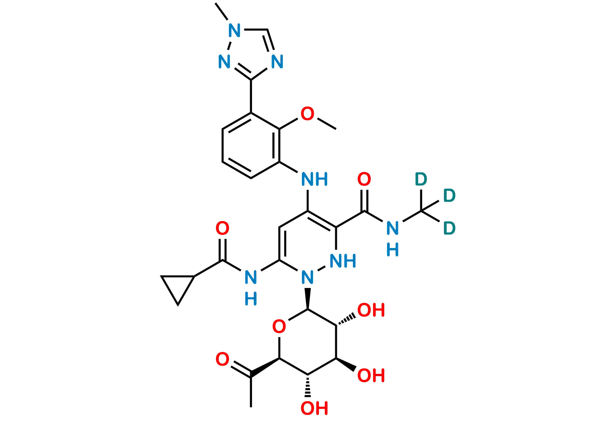 Chemical Name: 1-((2R,3R,4S,5S,6S)-6-acetyl-3,4,5-trihydroxytetrahydro-2H-pyran-2-yl)-6-(cyclopropanecarboxamido)-4-((2-methoxy-3-(1-methyl-1H-1,2,4-triazol-3-yl)phenyl)amino)-N-(methyl-d3)-1,2-dihydropyridazine-3-carboxamide