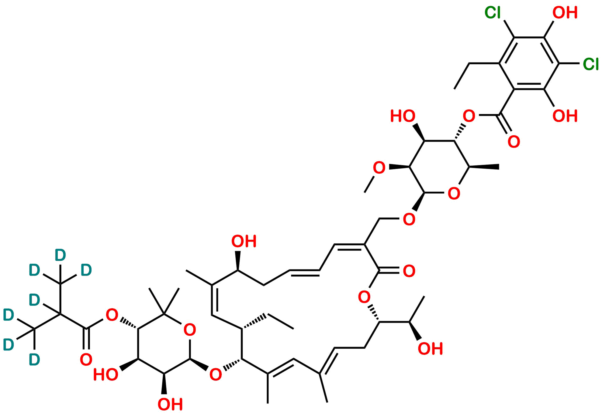 Chemical Name: (2R,3S,4S,5S,6R)-6-(((3Z,5E,8S,9Z,11S,12R,13E,15E,18S)-12-(((2R,3S,4R,5S)-3,4-dihydroxy-6,6-dimethyl-5-((2-(methyl-d3)propanoyl-2,3,3,3-d4)oxy)tetrahydro-2H-pyran-2-yl)oxy)-11-ethyl-8-hydroxy-18-((R)-1-hydroxyethyl)-9,13,15-trimethyl-2-oxooxacyclooctadeca-3,5,9,13,15-pentaen-3-yl)methoxy)-4-hydroxy-5-methoxy-2-methyltetrahydro-2H-pyran-3-yl 3,5-dichloro-2-ethyl-4,6-dihydroxybenzoate