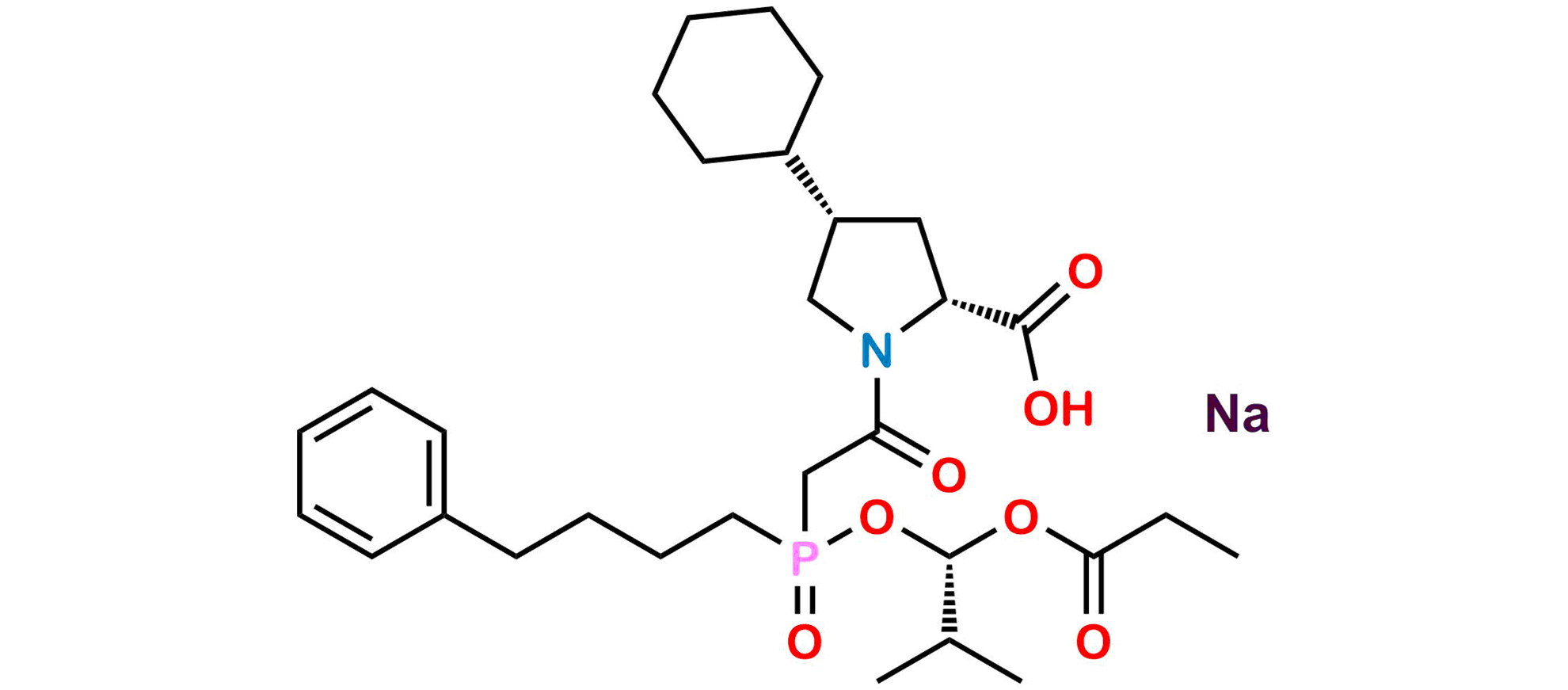 Chemical Name: (2R,4S)-4-cyclohexyl-1-(2-(((S)-2-methyl-1-(propionyloxy)propoxy)(4-phenylbutyl)phosphoryl)acetyl)pyrrolidine-2-carboxylic acid, sodium salt
