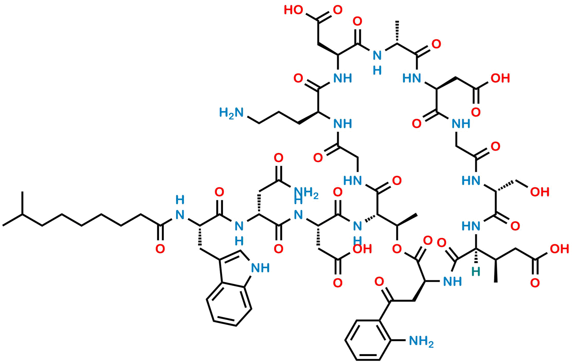 Chemical Name: 2,2'-(30-(2-(2-(3-(1H-indol-3-yl)-2-(8-methylnonanamido)propanamido)-4-amino-4-oxobutanamido)-3-carboxypropanamido)-3-(2-(2-aminophenyl)-2-oxoethyl)-24-(3-aminopropyl)-6-(1-carboxypropan-2-yl)-9-(hydroxymethyl)-18,31-dimethyl-2,5,8,11,14,17,20,23,26,29-decaoxo-1-oxa-4,7,10,13,16,19,22,25,28-nonaazacyclohentriacontane-15,21-diyl)diacetic acid