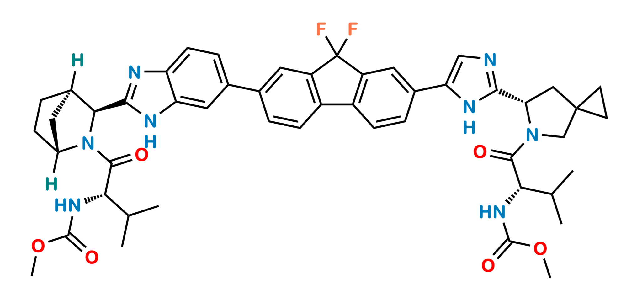 Chemical Name: Methyl ((S)-1-((S)-6-(5-(9,9-difluoro-7-(2-((1R,3S,4R)-2-((methoxycarbonyl)-L-valyl)-2-azabicyclo[2.2.1]heptan-3-yl)-1H-benzo[d]imidazol-6-yl)-9H-fluoren-2-yl)-1H-imidazol-2-yl)-5-azaspiro[2.4]heptan-5-yl)-3-methyl-1-oxobutan-2-yl)carbamate