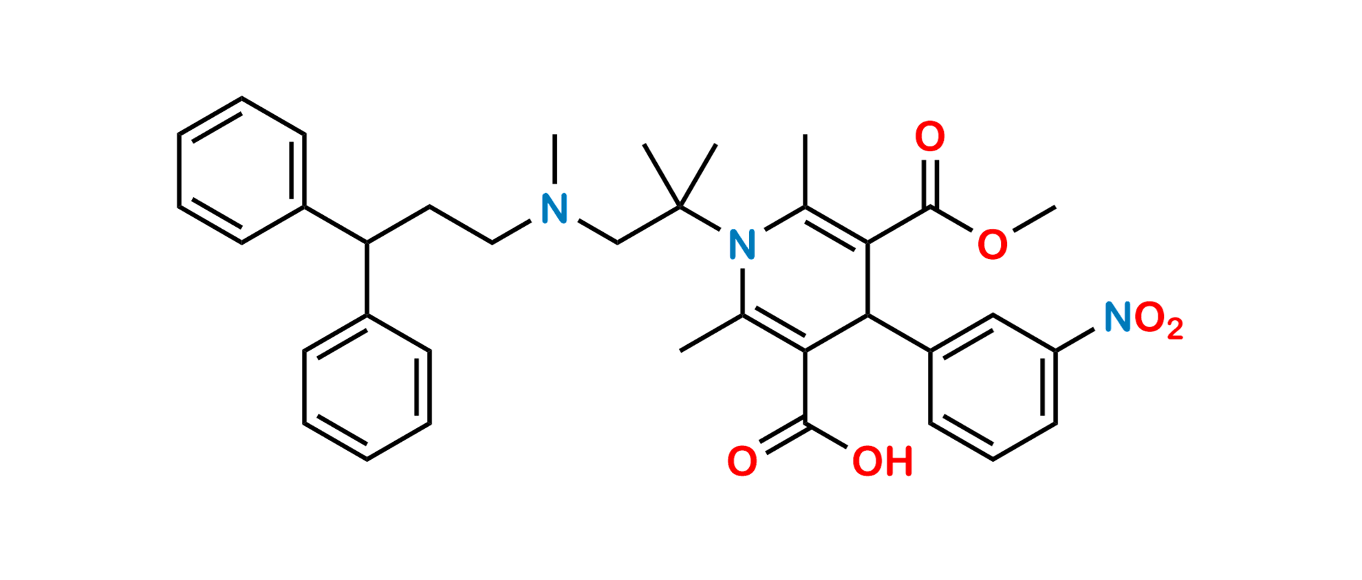 Chemical Name: 1-(1-((3,3-diphenylpropyl)(methyl)amino)-2-methylpropan-2-yl)-5-(methoxycarbonyl)-2,6-dimethyl-4-(3-nitrophenyl)-1,4-dihydropyridine-3-carboxylic acid