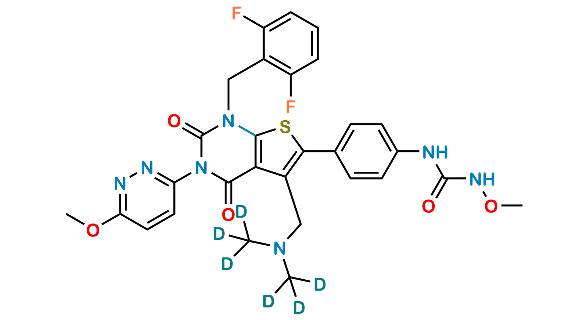 Chemical Name: 1-(4-(5-((bis(methyl-d3)amino)methyl)-1-(2,6-difluorobenzyl)-3-(6-methoxypyridazin-3-yl)-2,4-dioxo-1,2,3,4-tetrahydrothieno[2,3-d]pyrimidin-6-yl)phenyl)-3-methoxyurea