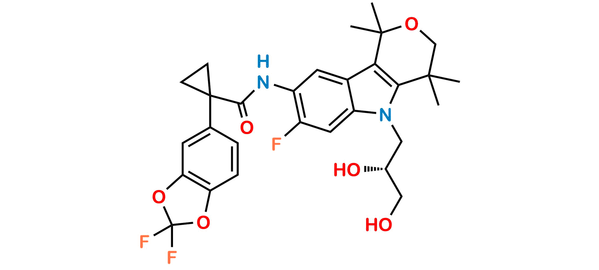 Chemical Name: (R)-1-(2,2-difluorobenzo[d][1,3]dioxol-5-yl)-N-(5-(2,3-dihydroxypropyl)-7-fluoro-1,1,4,4-tetramethyl-1,3,4,5-tetrahydropyrano[4,3-b]indol-8-yl)cyclopropane-1-carboxamide